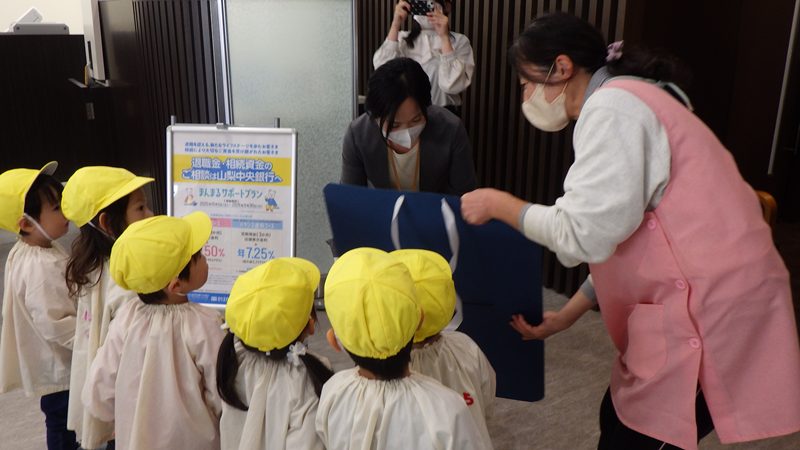 11月23日勤労感謝の日にちなみ満三歳児(ひまわり組)の子ども達は、山梨中央銀行に教師と一緒に、銀行のキャラクターをちぎり絵で作り「いつもお仕事ありがとうございます」とみんなで声を合わせ感謝の気持ちを伝え、カレンダーを渡してきました。