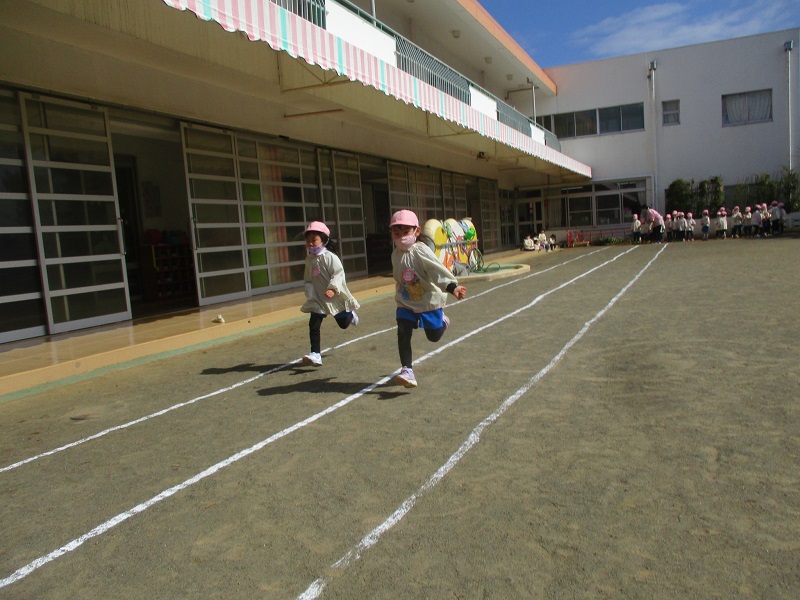 25m走が終わった後、戸外遊びをしていると、「よーいどんをしようよ!!」と自分達からかけっこを始め、先生と同じようにスターターをしている姿も見られました。