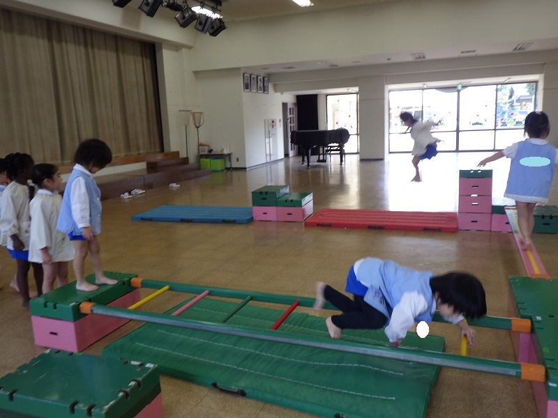 巧技台や平均台を、子どもたちに「自分達で考えて組み立ててみましょう」と声を掛けると、「やりたい」と大張りきりで取り組むようになりました。
