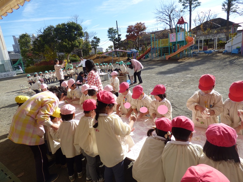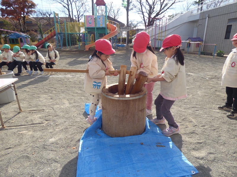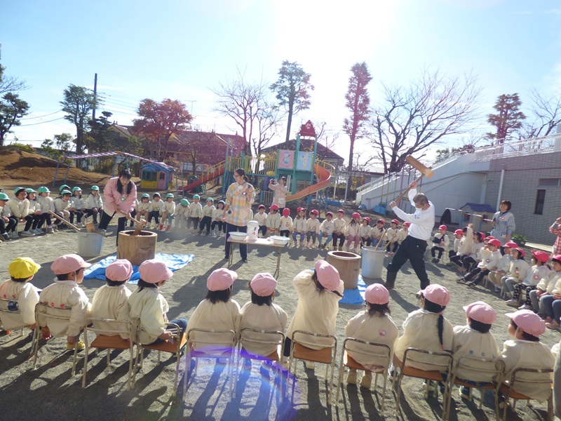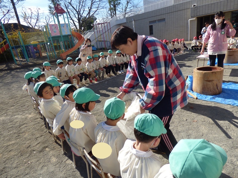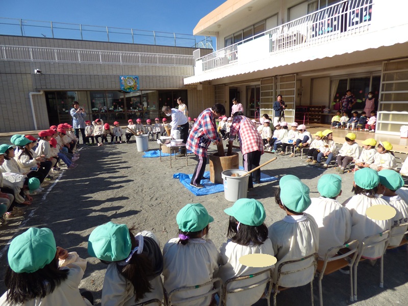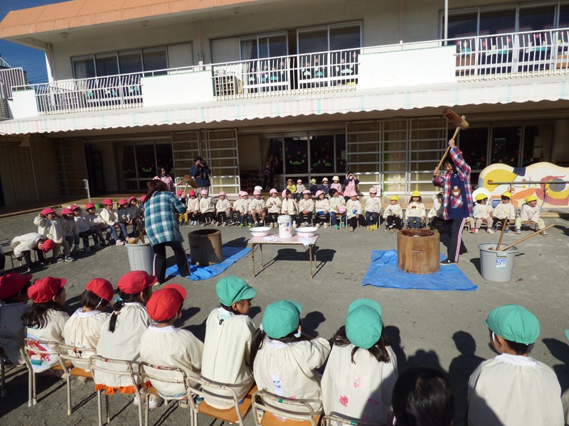 園長先生からも、もちつきは「よいしょ!よいしょ!」と家族みんなで協力する意味があると教えていただき、先生達がもちをつく様子をみて「よいしょ!よいしょ!」と大きい声で応援していました。