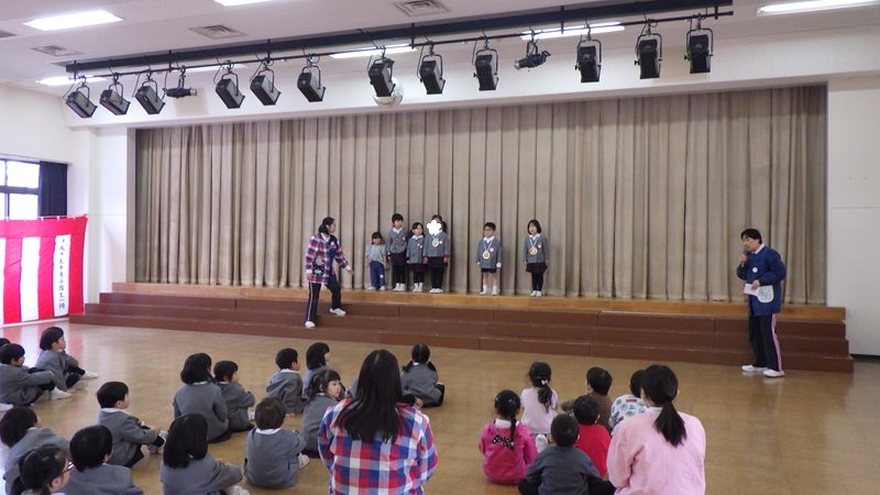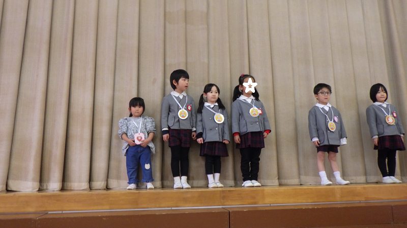園長先生からの話が終わり、「皆勤・精勤賞」の発表があり、お名前を呼ばれた子どもは少しドキドキしながら、6名の子ども達が担任の先生からペンダントを頂きとてもうれしそうでした。