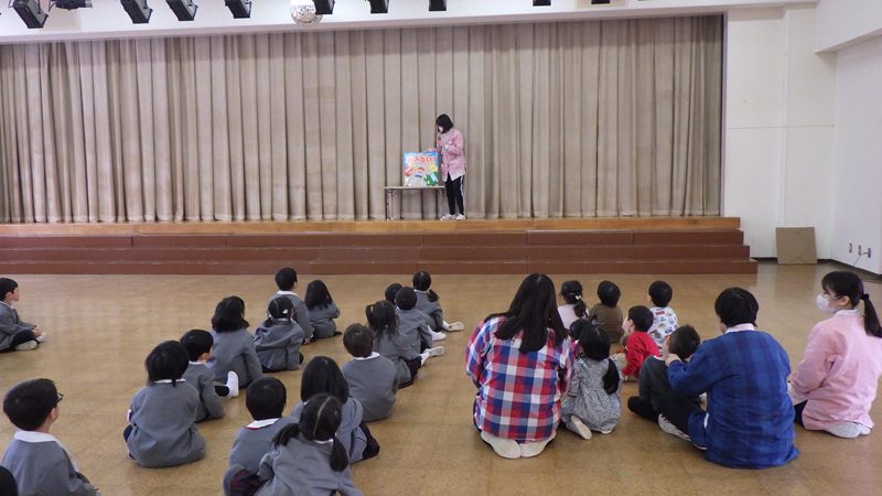 先生方からのもう一つのお約束、保護者の方と遊びに行く時やお買い物に行く時のお約束、春の交通安全にちなみ大型絵本「あぶない」を読んで頂きました。