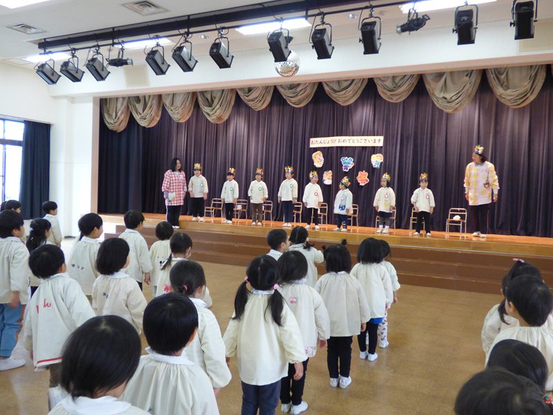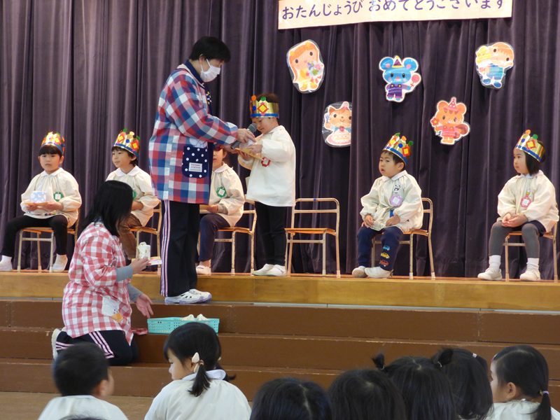 12月の誕生会では、園長先生からプレゼントをいただき嬉しそうな誕生児の子ども達でした。