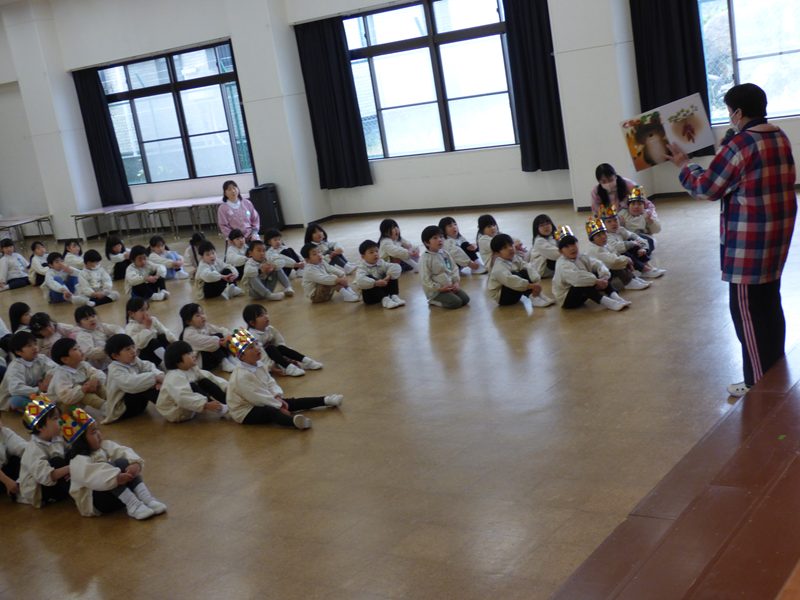 園長先生からは「くまときつね」の絵本を読んでいただき、真剣に最後まで聞く姿が見られ、子ども達の話の聞き方も成長を感じることができました。