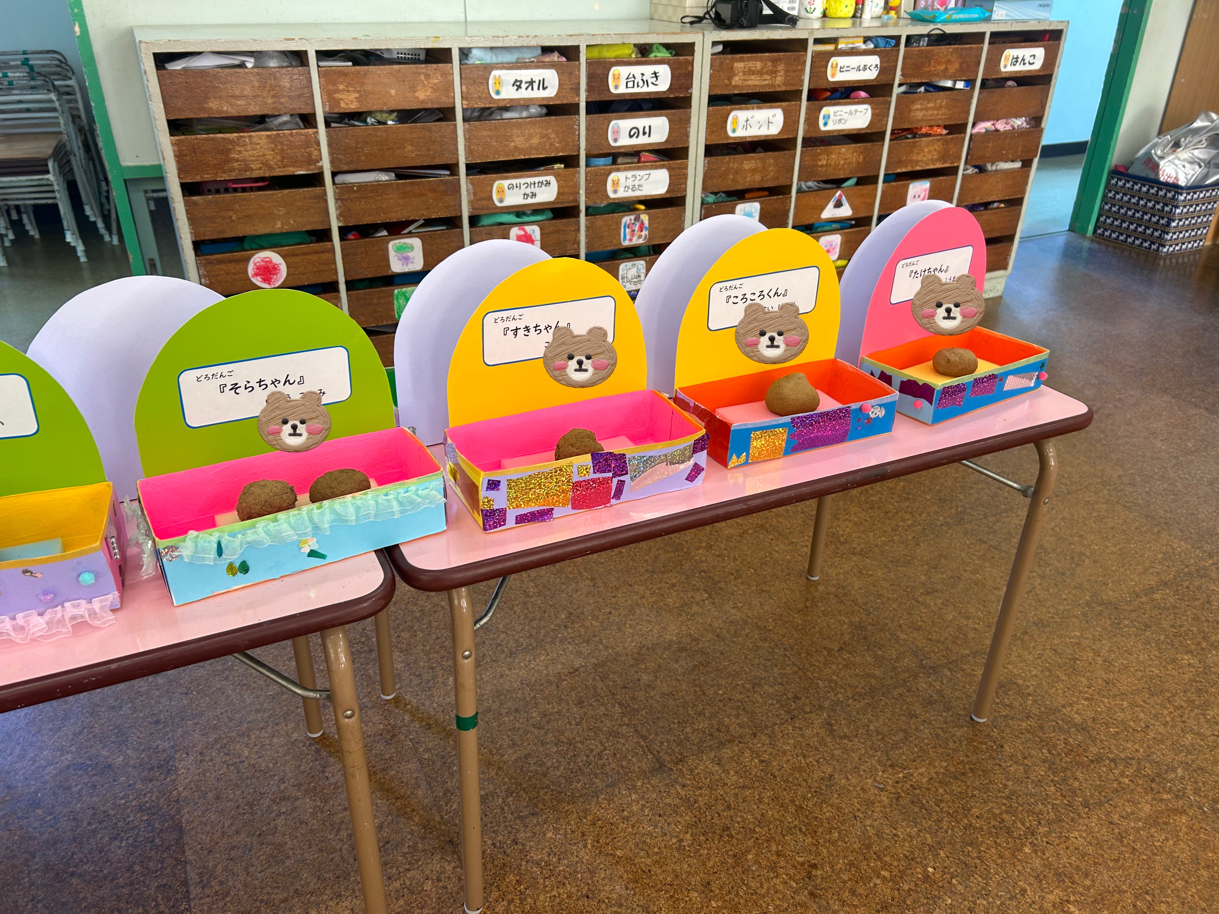 年長組は、「泥だんご」、年中組は「クラスみんなで土粘土で理想の築山」年少組は「一人一つの築山作り~こんな築山になったらいいな~」を作りました。