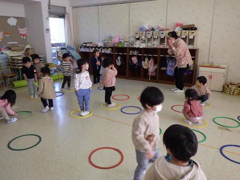 リングを使って遊びました。色を指定し、指定されたリングにはいります。