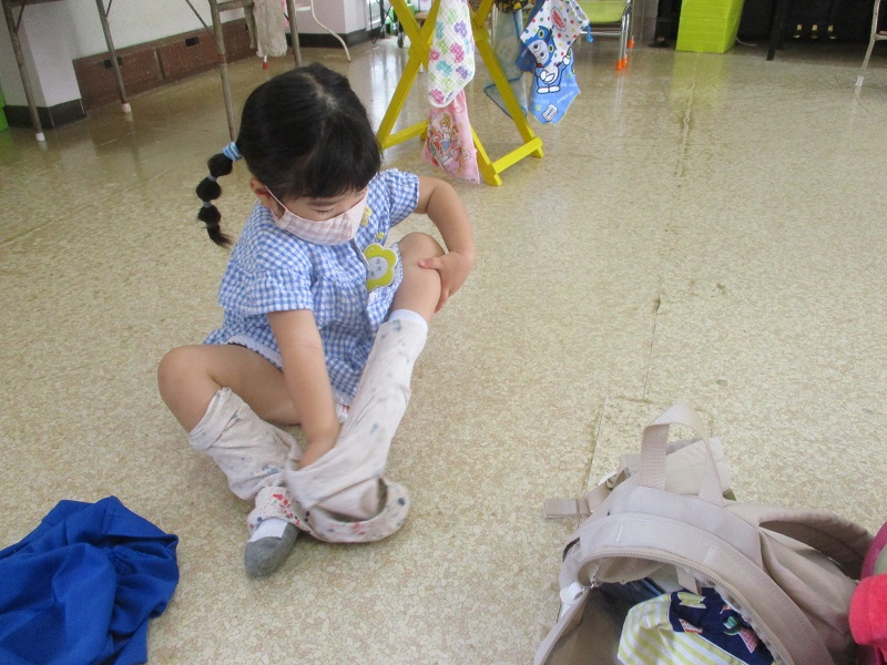 登園すると自分達でズボンを脱ぎ始め、スモック・体操ズボンに履き替えて、所持品の始末も頑張っている姿が見られるようになってきました。