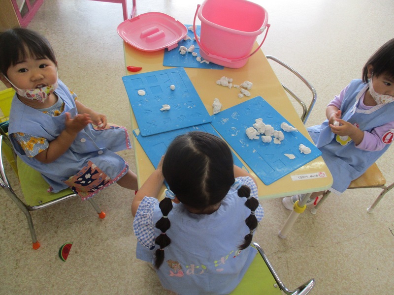 「入れて」「いいよ」の言葉が少しずつ出てくるようになり、野菜・果物を切っては、お皿に乗せて遊んでいたり、粘土コーナーでは、お団子・あめ玉などお菓子屋さんになって、朝友達と楽しく遊べるようになってきた子ども達です。