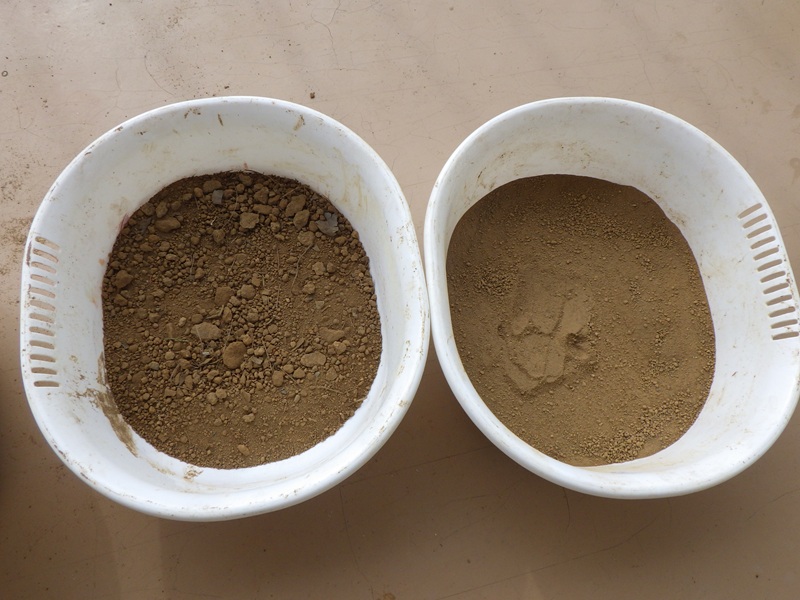 それを子どもたちで細かく砕いて、ふるいにかけました。