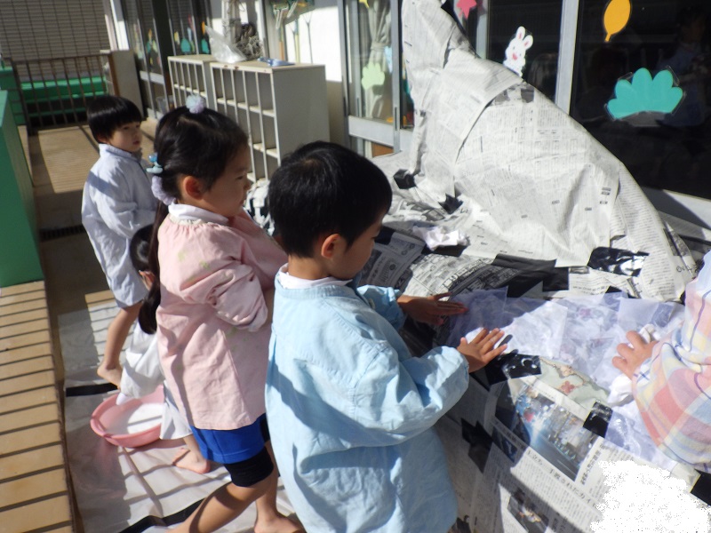 重なっている和紙を丁寧にはがして貼ったり、和紙を広げて貼ったり「上にも貼ろう」「下もいっぱい貼れるよ」などと言いながら、みんなで頑張って貼りました。