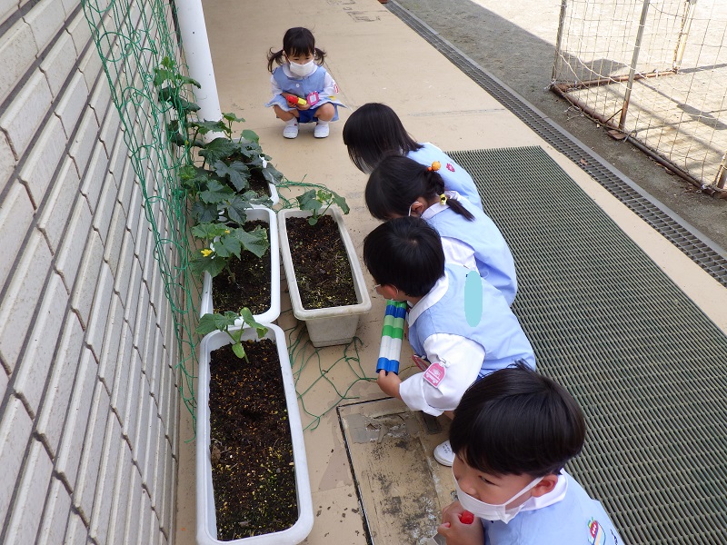 「ここに大きいトマトがあるよ!」と教えたり、黄色い花の下に小さなきゅうりが出来ていることに気づいたりして、大発見を友達同士で喜ぶ姿も見られました。