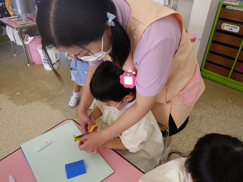 はさみを使って折り紙を半分に切ることを伝えると、日頃からはさみ遊びをしてきたことで、「やりたい!」「見てて!」「まっすぐ切れたよ」と言って、喜んで取り組むことができました。