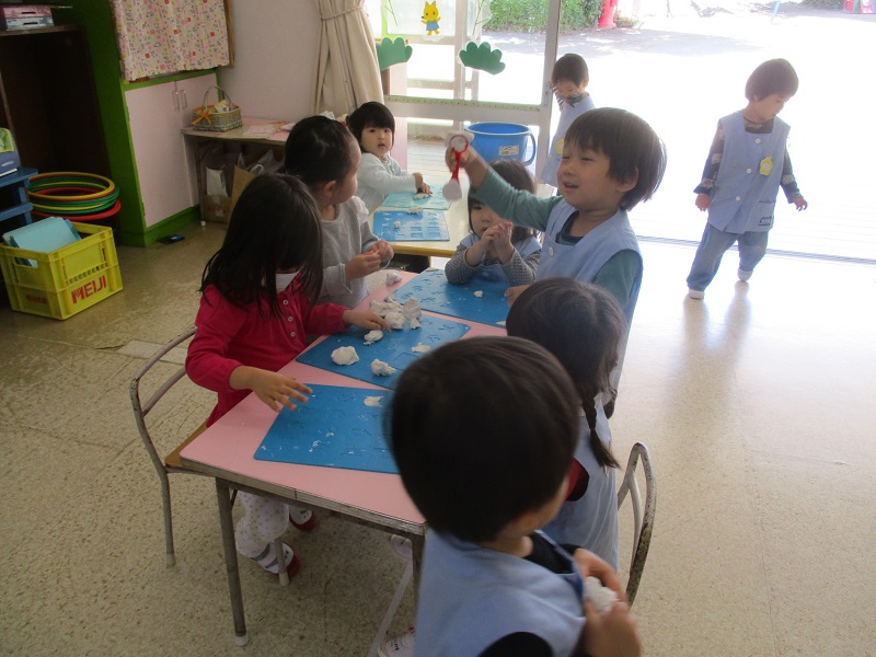 今日も元気な子ども達、サンサン体操やたけのこ体操をして遊んでいる中、ちゅうりっぷ組のお友達が遊びに来てくれて粘土で遊びました。