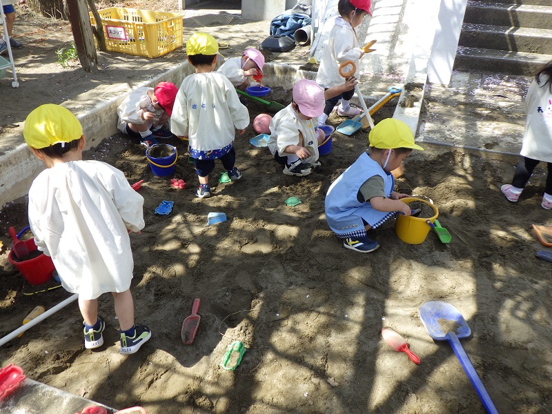 天気の良い日には、砂場遊びや園で飼育している金魚に挨拶をしたり、給食も楽しみにしたりする姿も見られるようになりました。