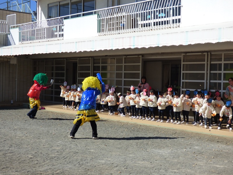 歌い終わると鬼の姿が見え、子ども達は持っていた豆を「鬼は外、鬼は外!」「福は内!!」と鬼に向かって元気に投げたり、鬼が怖くて教師の近くにいながらも鬼に豆を投げたりする子ども達の姿も見られました。