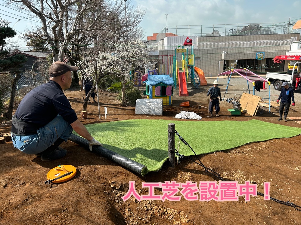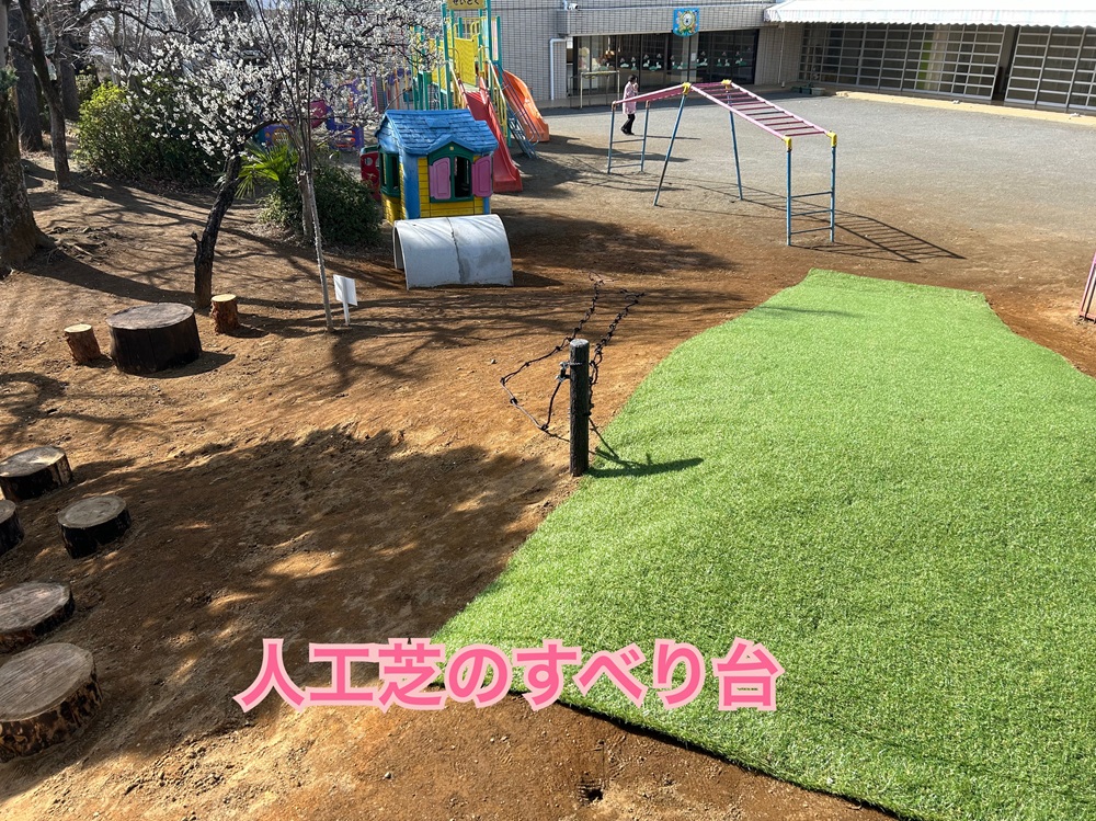 今回、幼稚園の向かいにある藤橋造園さんにご協力いただき、子ども達の絵や作った築山をもとに、トンネルや人工芝、階段やロープなどを準備していただきました。