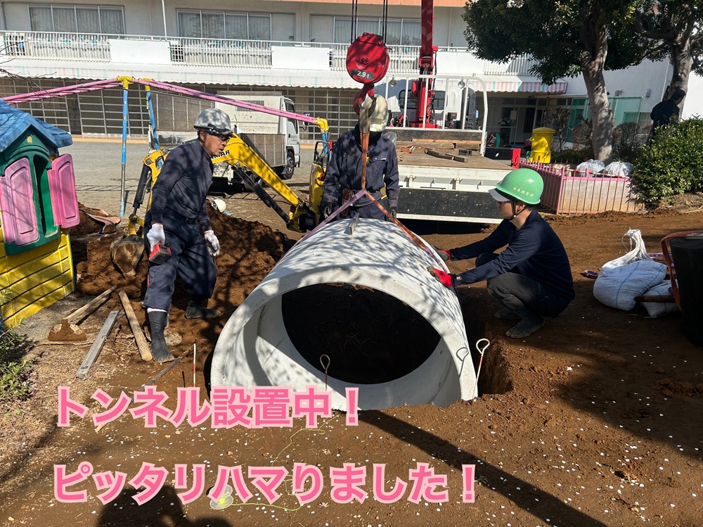 トンネルや大きな木材を運び設置するため、クレーンやショベルカーを使っての作業となりました。