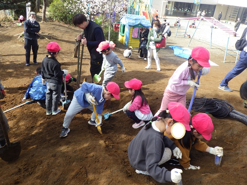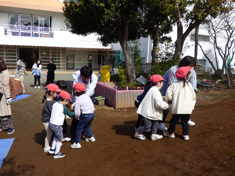 そして年長児と年中児が、2月26日27日に行われた保育公開の時に、藤橋造園さんの方々から築山づくりについてお話を伺ったり、どこに何を置くのかを一緒に考えたりしました。