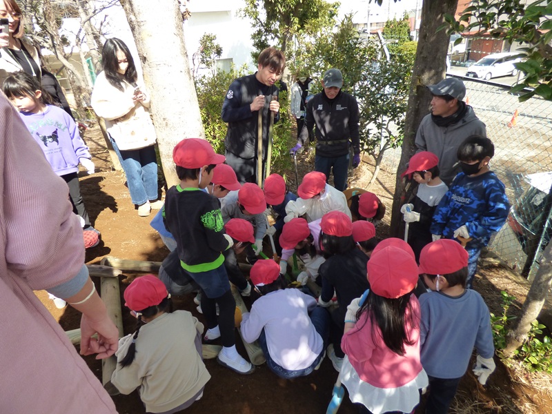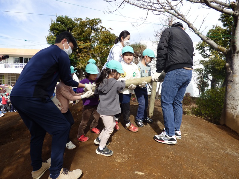 そして、保護者の方にもご協力いただき、実際に木材や道具を運んだり、土を掘ったりして、藤橋造園さんと一緒に築山づくりを行いました。