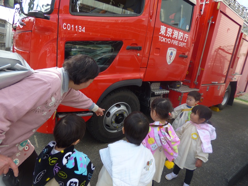 消防署の方も来てくださり、子ども達に消防車を見せてくださいました。