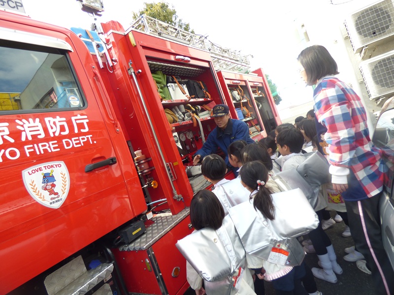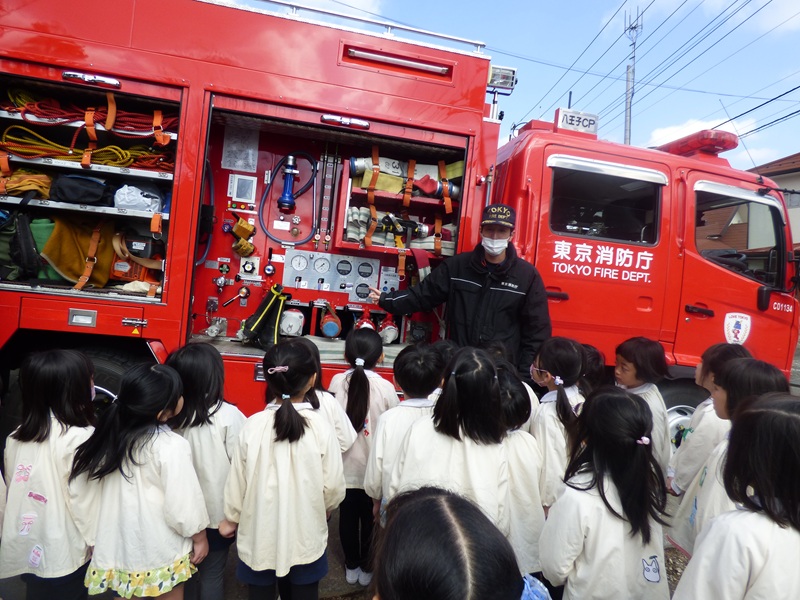 いろいろな道具に関心をもち「これはなんですか?」と子ども達が質問すると、消防署の方は一つひとつ丁寧に教えてくださいました。