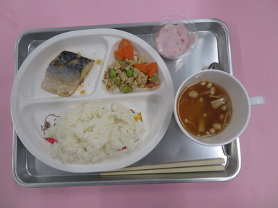 Home > 今日の給食 > ご飯 さばの味噌煮 炒り豆腐 えのきのみそ汁 いちごフルーチェ