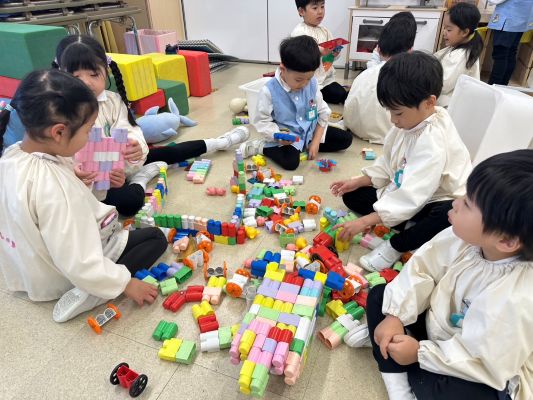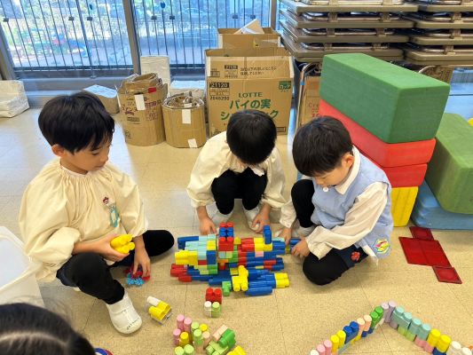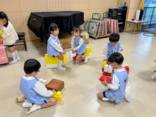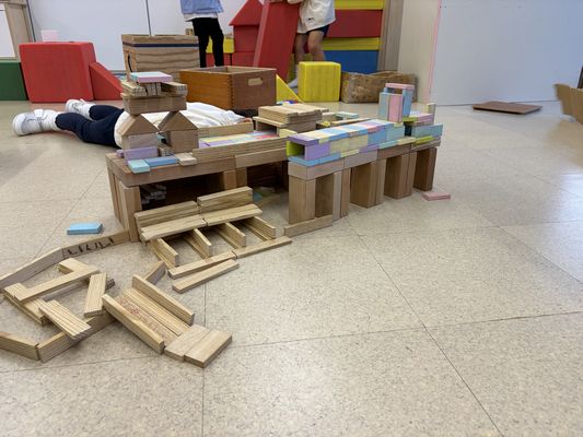 遊戯室にある大型積み木や大型ブロックを使ってクラ