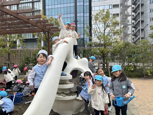 砂場のシンボルでもある像にみんなで登ってハイ!チ