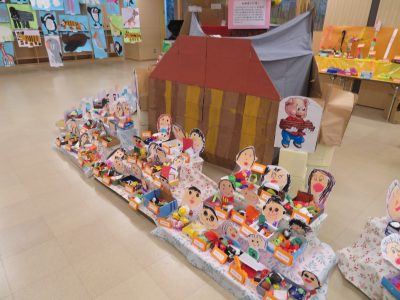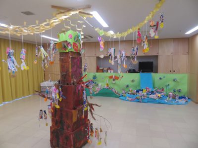 絵や切った折り紙や広告紙を貼ったミノムシなど