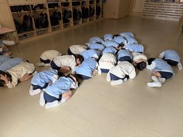 年少・桜組さんは、幼稚園で初めての防災訓練