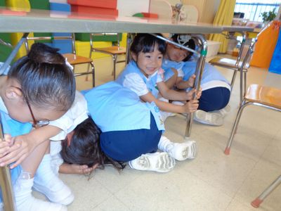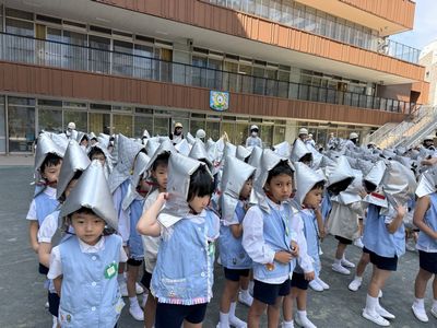 防災帽子を被って園庭に避難した後、津波の危険
