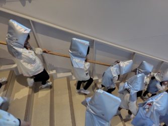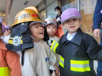 子どもたちは「火事」の知らせを聞き、防災帽子を