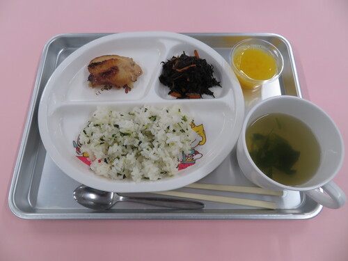 Home > 今日の給食 > 菜飯 鶏の甘辛焼き ひじきの煮物 三つ葉のすまし汁 オレンジゼリー