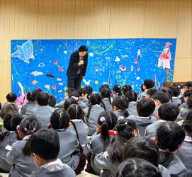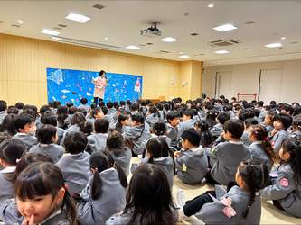 全学年の子どもたちが遊戯室に集まり、姿勢を正