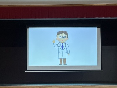 3学年が3階のホールに集まり、お話を聞く