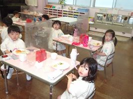 た!幼稚園初めての給食では、分散登園の