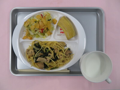 2026.01.16 1月16日(金) 鶏肉と小松菜の和風スパゲッティー 今日のメニューは、 ☆鶏肉と小松菜の和風スパゲッティー ☆牛乳 ☆コーンフレークサラダ ☆バナナ です。 ※写真は年中(うめ)組の量になります。