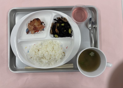 2026.01.26 1月23日(金) トマトの照り焼きチキン 今日のメニューは、 ☆ご飯 ☆オクラの味噌汁 ☆トマトの照り焼きチキン ☆ひじきの煮物 ☆いちごゼリー です。 ※写真は年中(うめ)組の量になります。