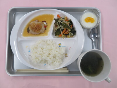 2026.01.27 1月27日(火) 揚げ鶏の甘酢ねぎソース 今日のメニューは、 ☆ご飯 ☆チンゲン菜のスープ ☆揚げ鶏の甘酢ねぎソース ☆中華風わかめサラダ ☆ミルク寒天 です。 ※写真は年中(うめ)組の量になります。