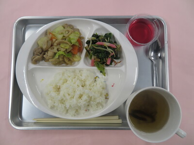 2026.01.30 1月30日(金) 鶏肉と根菜の味噌炒め 今日のメニューは、 ☆ご飯 ☆すまし汁 ☆鶏肉と根菜の味噌炒め ☆小松菜とかまぼこのおかか和え ☆ぶどうゼリー です。 ※写真は年中(うめ)組の量になります。