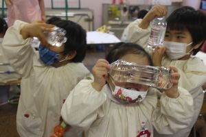 他の子ども達も、目にペットボトルをあて