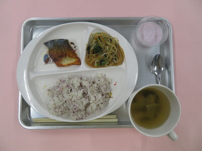 2025.10.15 10月15日 さばの味噌煮 今日のメニューは、 ☆ゆかりご飯 ☆けんちん汁 ☆さばの味噌煮 ☆春雨の和風サラダ ☆ブルーベリーヨーグルト です。 ※写真は年中(うめ)組の量になります。