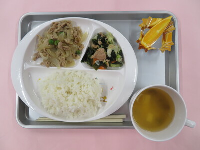 2025.10.20 10月20日(月) 豚肉の生姜焼き 今日のメニューは、 ☆ご飯 ☆豆腐となめこの味噌汁 ☆豚肉の生姜焼き ☆ツナとわかめの酢の物 ☆オレンジ です。 ※写真は年中(うめ)組の量になります。