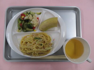 2025.10.22 10月22日(水) ツナとキャベツのクリームスパゲティ 今日のメニューは、 ☆ツナとキャベツのクリームスパゲティ ☆りんごジュース ☆花野菜サラダ ☆バナナ です。 ※写真は年中()うめ組の量になります。
