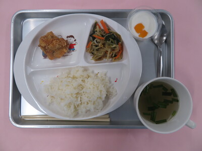 2025.10.28 10月28日(火) 鶏肉のごま揚げ 今日のメニューは、 ☆ご飯 ☆ニラの中華スープ ☆鶏肉のごま揚げ ☆もやしの中華和え ☆ピーチヨーグルト です。 ※写真は年中(うめ)組の量になります。