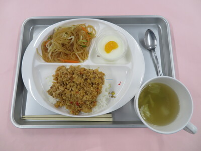 2025.11.12 11月12日(水) ジャージャー丼 今日のメニューは、 ☆ジャージャー丼 ☆白菜の中華スープ ☆中華風春雨サラダ ☆フルーツミルク寒天 です。 ※写真は年中(うめ)組の量になります。