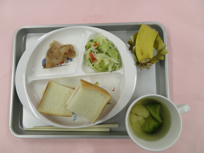 2025.11.13 11月13日(木) ローストチキン 今日のメニューは、 ☆いちごジャムサンド ☆花野菜のスープ ☆ローストチキン ☆キャベツとパプリカのマリネ ☆バナナ です。 ※写真は年中(うめ)組の量になります。