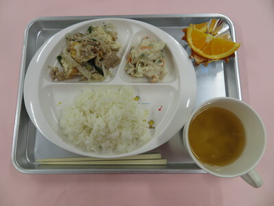 2025.11.17 11月17日(月) 豚肉のねぎ塩炒め 今日のメニューは、 ☆ご飯 ☆里芋の味噌汁 ☆豚肉のねぎ塩炒め ☆切干大根のごまドレッシングサラダ ☆オレンジ です。 ※写真は年中(うめ)組の量になります。
