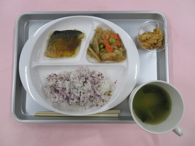 2025.11.19 11月19日(水) さばのカレー焼き 今日のメニューは、 ☆ゆかりご飯 ☆ほうれん草の味噌汁 ☆さばのカレー焼き ☆レンコンのきんぴら ☆きな粉マカロニ です。 ※写真は年中(うめ)組の量になります。