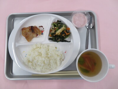 2025.11.21 11月21日(金) 鶏肉のごま味噌焼き 今日のメニューは、 ☆ご飯 ☆かまぼこのすまし汁 ☆鶏肉のごま味噌焼き ☆小松菜ときのこのおひたし ☆いちごのフルーチェ です。 ※写真は年中(うめ)組の量になります。